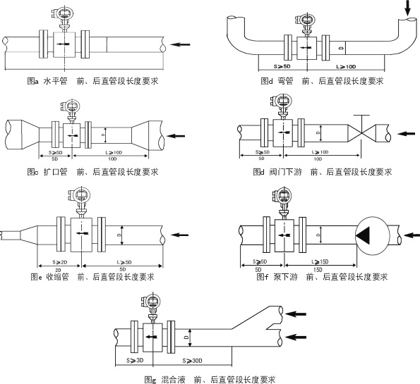 技術(shù)人員在安裝流量計時,都需要準確得到計量設(shè)備對前后直管的詳細長度長度要求,而目前多數(shù)流量計生產(chǎn)廠家都注意到了這一點,進而滿足了這方面的要求,在流量計的出場說明書上強調(diào)了流量計對前后直管的長度。
