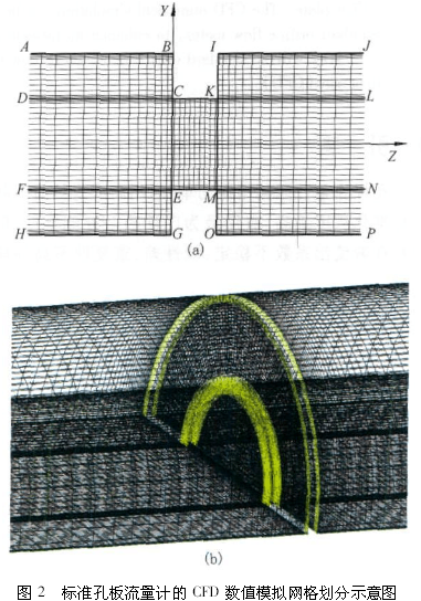 為了準確捕捉孔板前后流場的變化情況,以上、下游直管段內與孔板等孔徑的圓柱面為分界面實施Split操作(圖2(a)中所示為線段DC、FE、KL、MN),并將邊界層作為一種網格加密的技巧在此予以應用:分界圓柱端面向外、向內邊界層的行百分比選用15%,共10層,比例設為1.1;分別將圓環面和半圓面以Map、Pave的方式進行網格劃分。上游直管段的軸向網格密度沿BA、CD、EF、GH方向以1.1的比例由密變疏,下游直管段的軸向網格密度沿IJ、KL、MN、OP方向以1.1的比例由密變疏,孔板軸線方向(CK、EM)上的網格平均分布。***后采用Cooper進行網格劃分,***終所得網格劃分情況如圖2(b)所示。